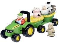 Chunky John Deere tractor pulls along farm animals. The animals are removable, and must be matched with their correct seats in the wagon. Each animal makes realistic sounds when they are pushed down; toy plays "Old McDonald" when the farmer figure is pushed. Recommended for ages 18 months and over.